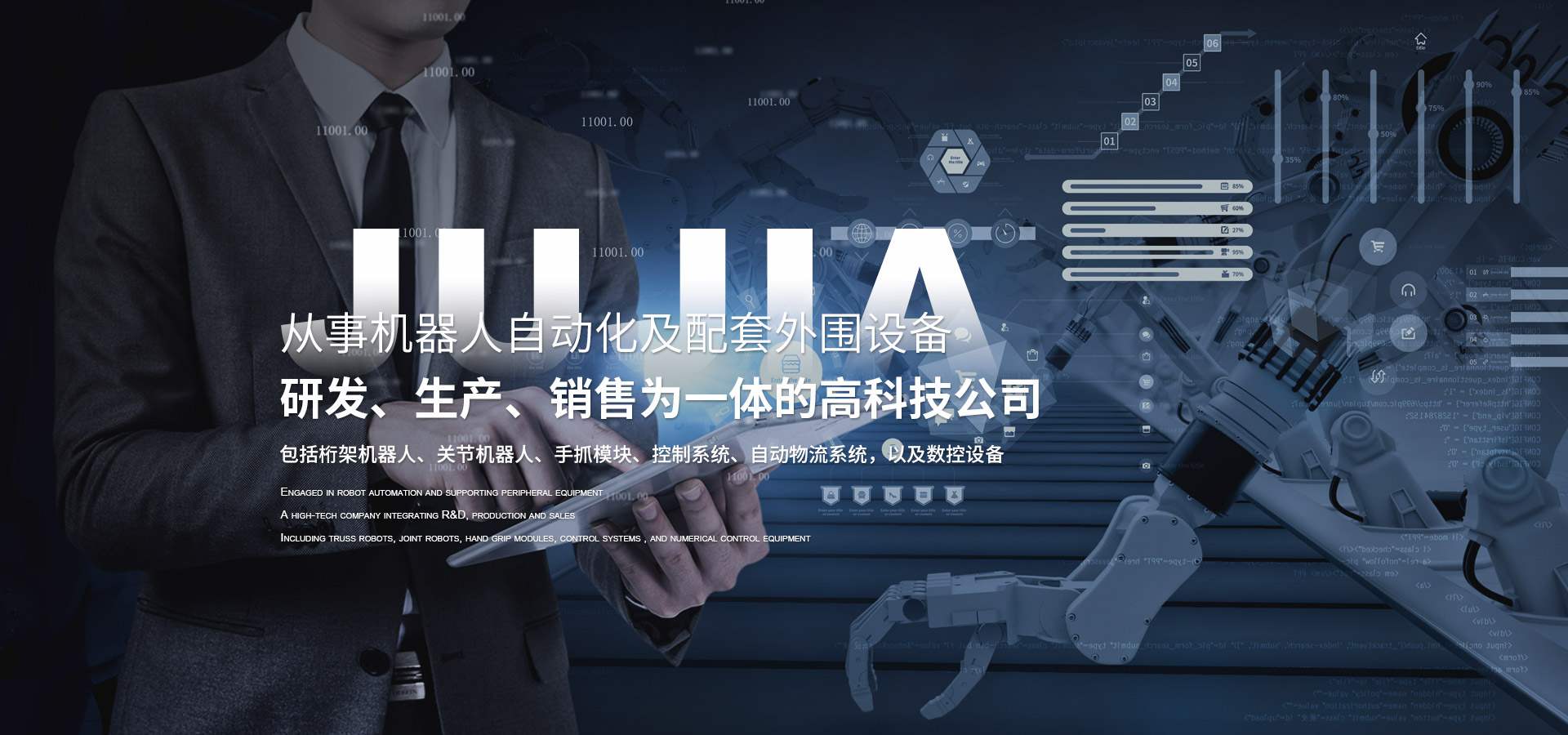 從事機器人自動化設備及配(pèi)套外圍(wéi)設備,包括桁架機器人、關節機器人、手抓(zhuā)模塊(kuài)、控製(zhì)係統、自動物(wù)流係統等